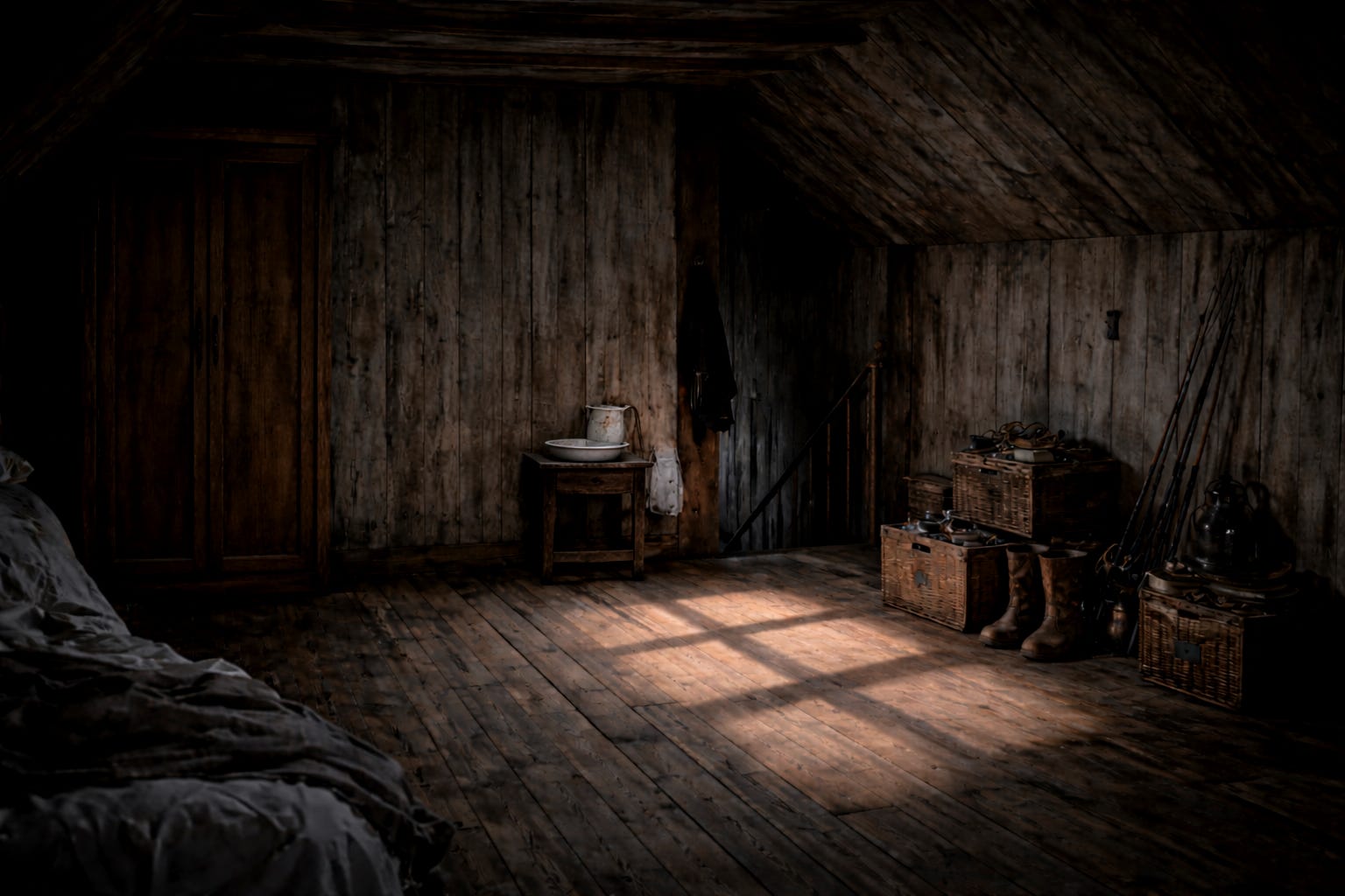 I pad to the wardrobe, Autumn cold licking my ankles. The loft presses in around me—bare wood and slanted squares of dawn, like the hold of a small boat. I step over old boots, past stacked boxes. Three fishing rods lean in the corner—the cargo of our lives.
