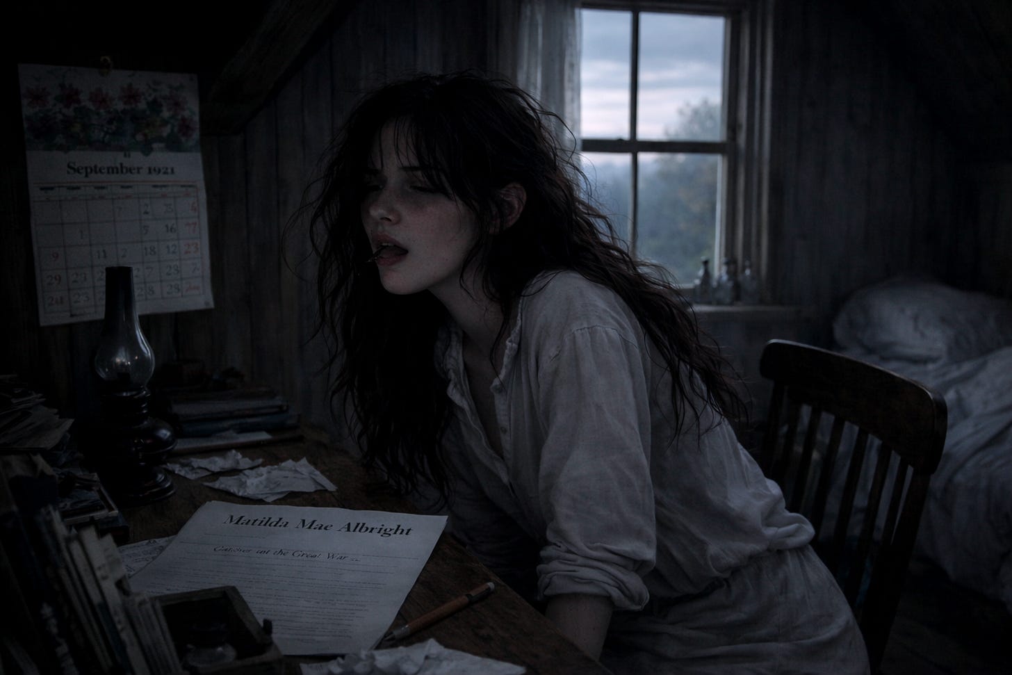 I try to stand—my toes curl, numb on the cold wood—but my legs won’t hold. I catch myself on the desk, and the calendar wobbles over it: September, 1921. Bee balms over the grid, blooming with black middles and red petals. Murray’s General printed at the top.