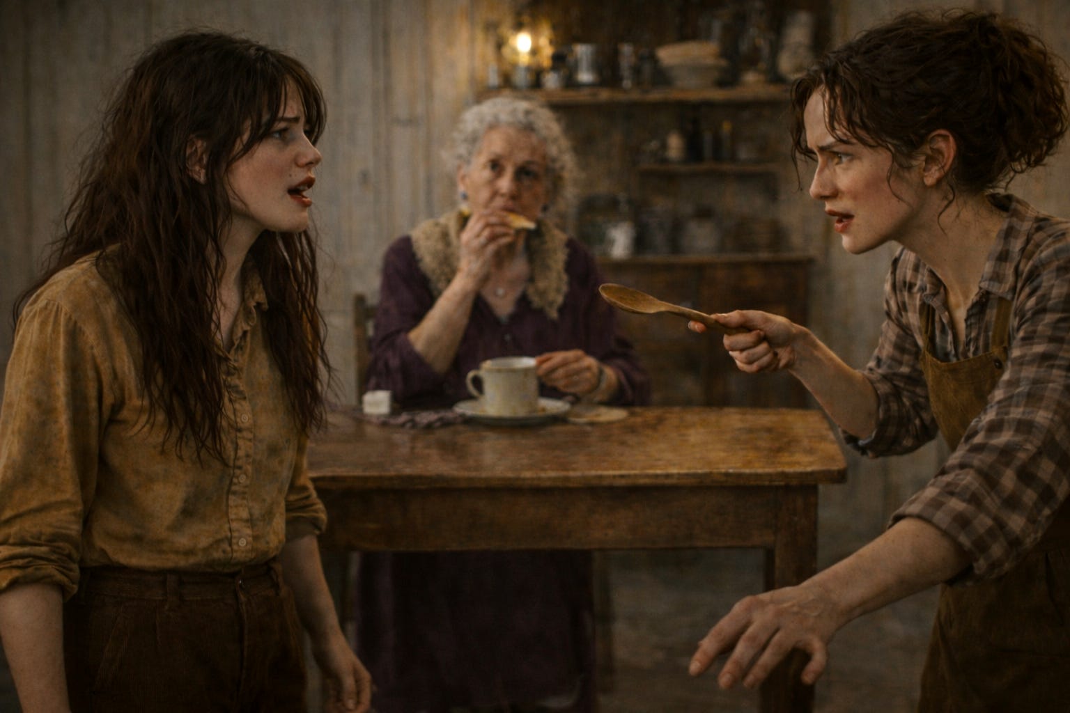 “You think I’d trade a few shifts so you can waste what you’ve got? Girls who finish school make office wages. Girls like me sew knickers for thirty-two cents an hour.” She steps closer, spoon still in her hand—unbroken. “I will not let you waste your life making lacy underthings for those hoity-toity hussies up in the hills.”